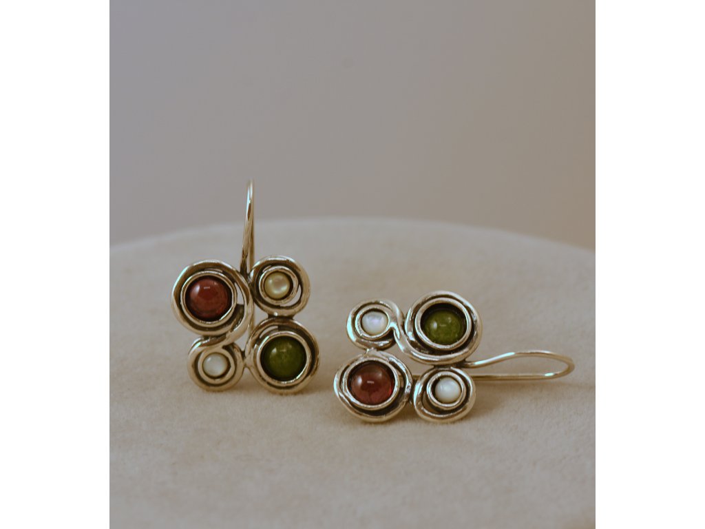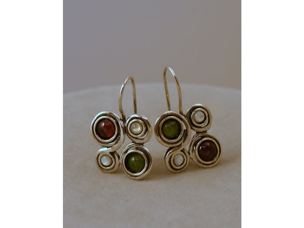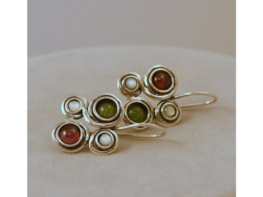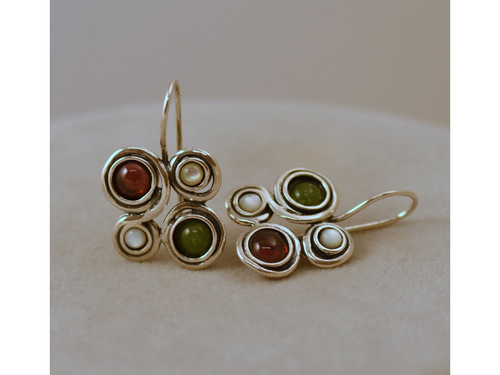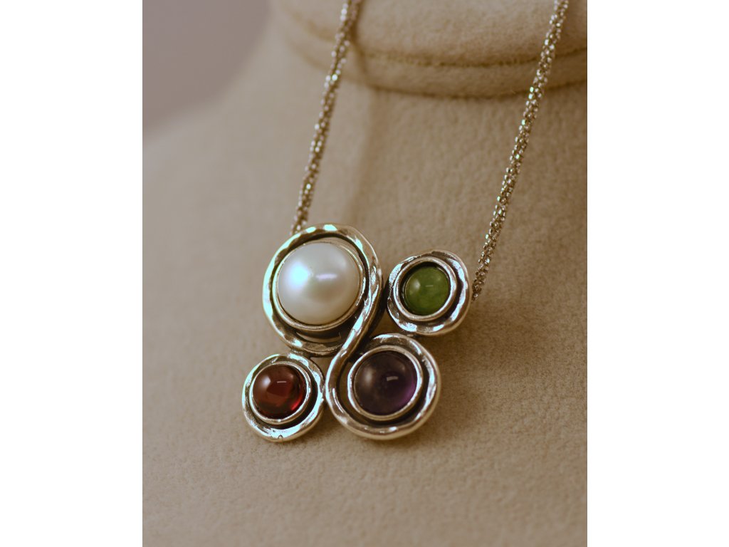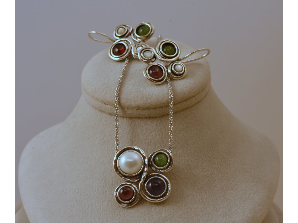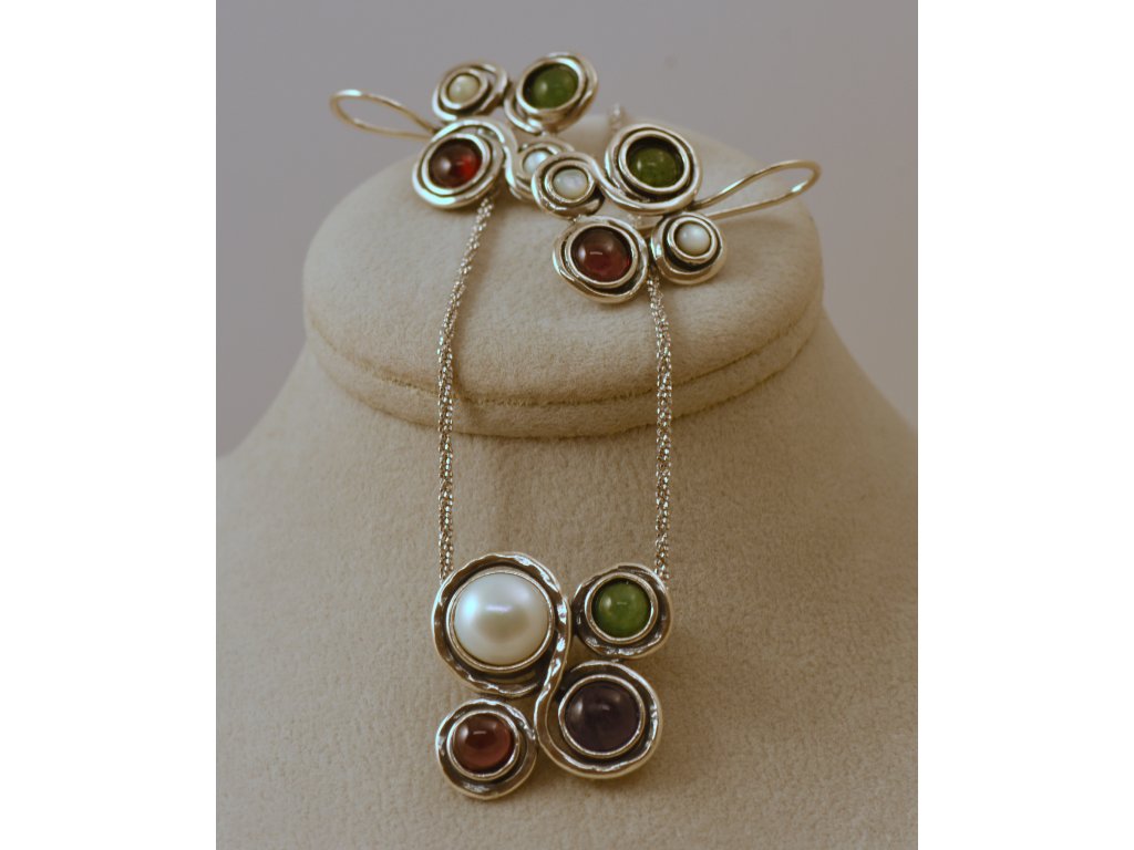 Originální souprava stříbrných náušnic a náhrdelníku s kameny (ametyst, aventurín, granát, perleť a bílá perla. Ruční izraelská práce.