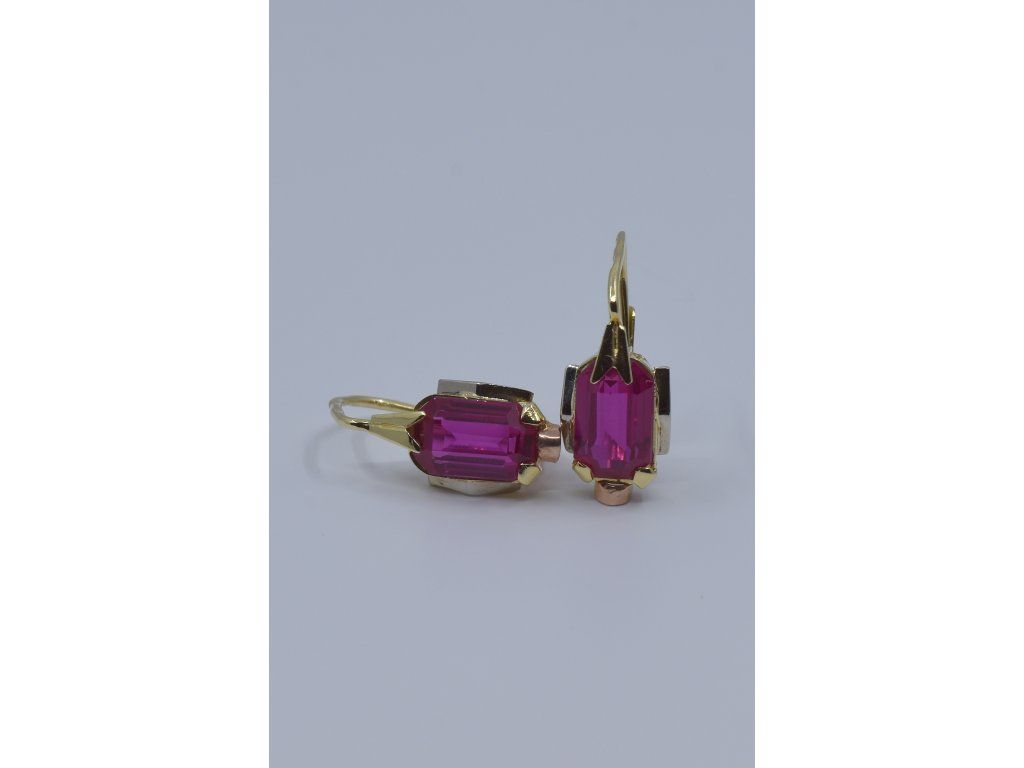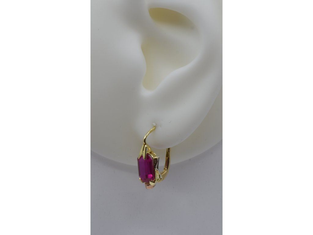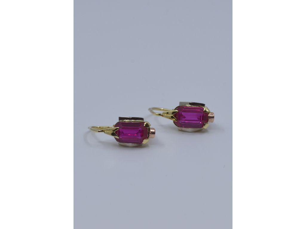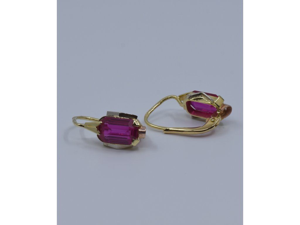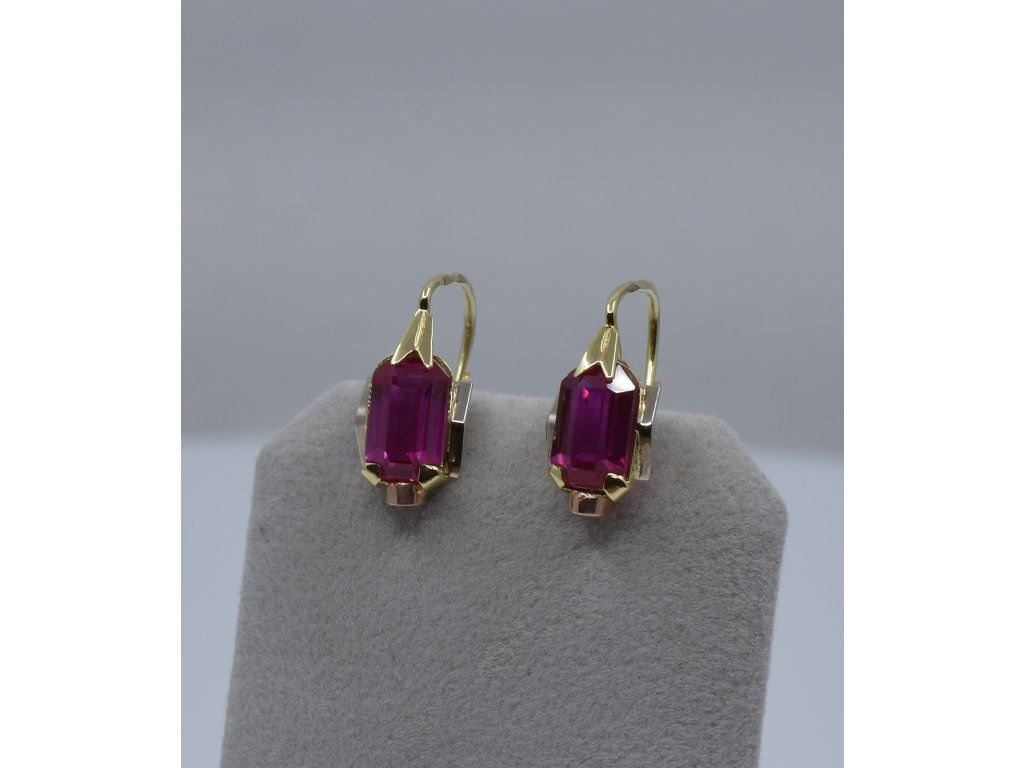 Dámské náušnice ze žlutého zlata s rubínky, zapínání na patenty. Rozměr zdobné části 7,35 x 13,52 mm, velikost rubínu 5,36 x 8,86 mm. Délka náušnice 16,47 mm.