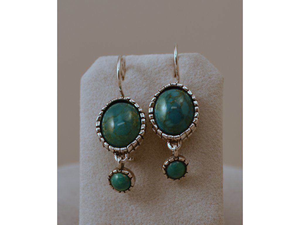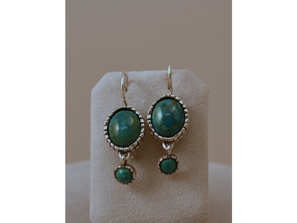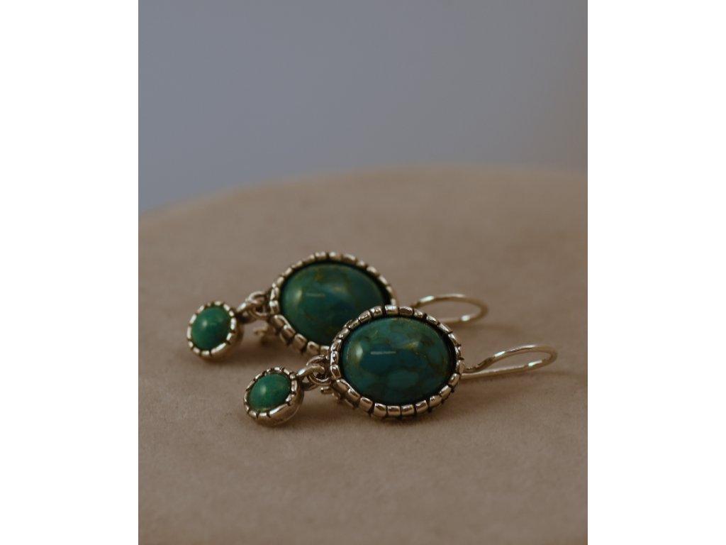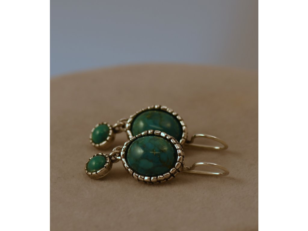 Stříbrné náušnice s oválnými tyrkysy. Rozměr oválků 14,90 x 12,60 mm, průměr kulatých tyrkysů 6,80 mm. Ruční izraelská práce.