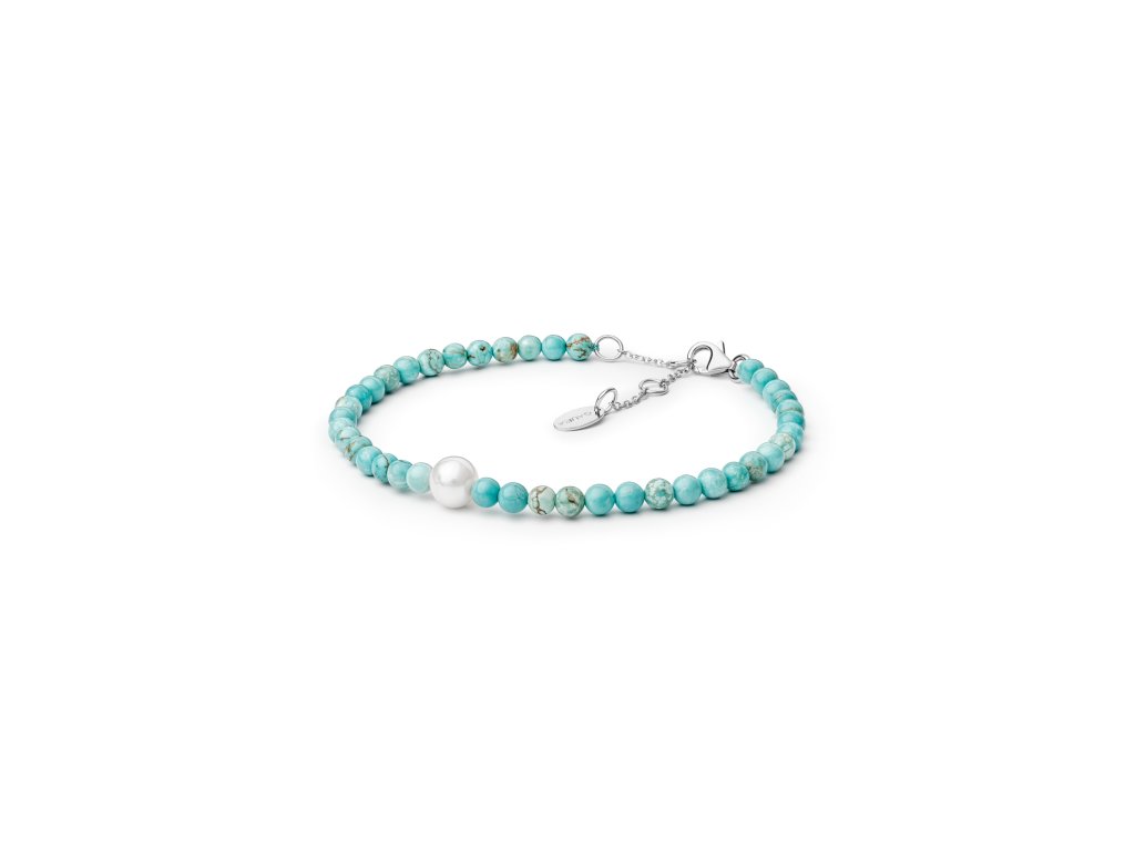 Náramek z barveného howlitu (v tyrkysové barvě) a bílé perly, průměr kuliček howlitu 4,20 mm, průměr perly 7,60 mm. Délka náramku posuvná 18 - 21 cm, stříbrné zapínání.