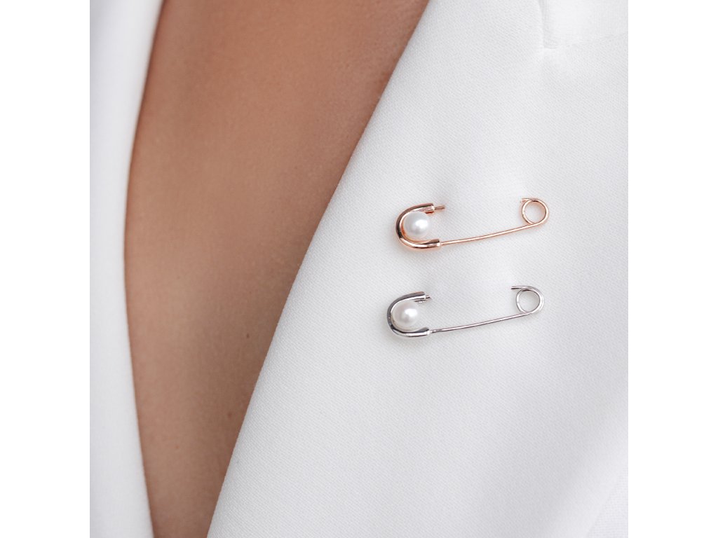 Stříbrná brož s bílou perlou - špendlík. Délka brože 37,74 mm, průměr perly 6,57 mm.