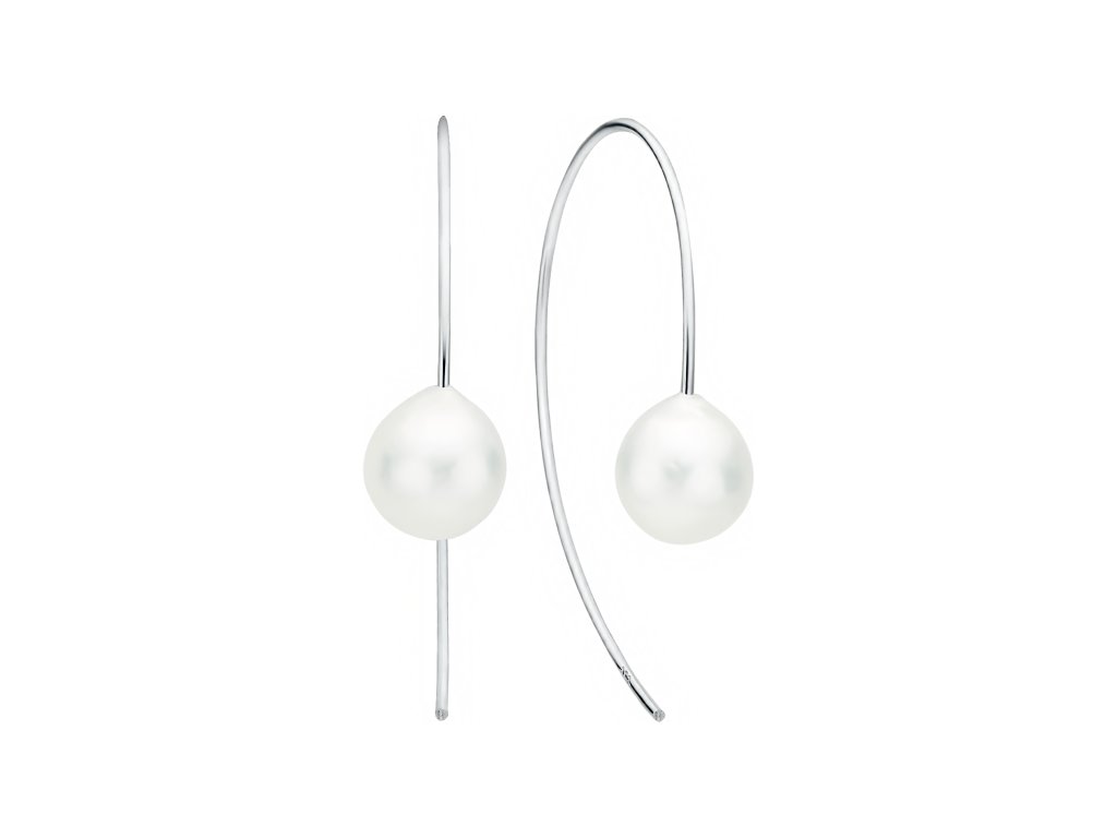 Stříbrné provlékací náušnice s bílými perlami. Celková délka náušnic 45 mm, přírodní perly o průměru 11,50 mm. Rhodiované stříbro.