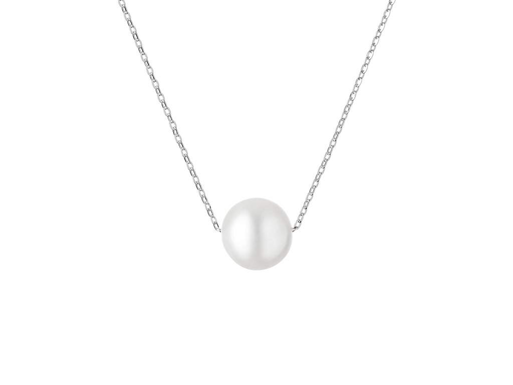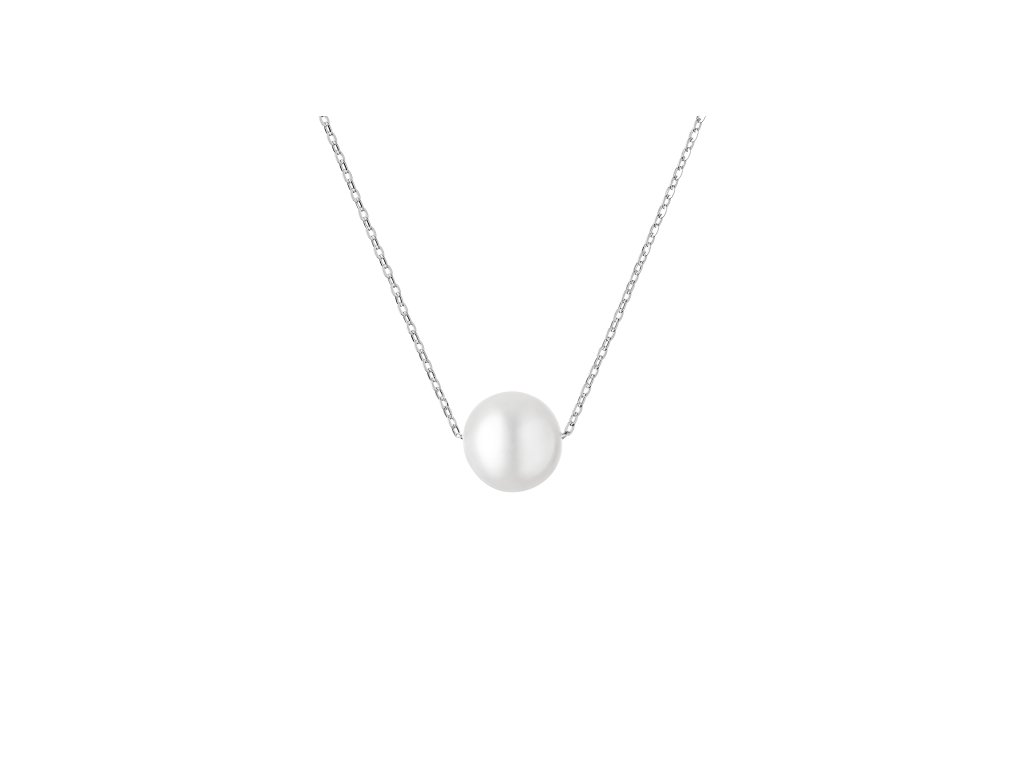 Jemný náhrdelník s bílou perlou. Posuvné zapínání do 45 cm, rhodiované stříbro. Průměr perličky 9,60 mm.