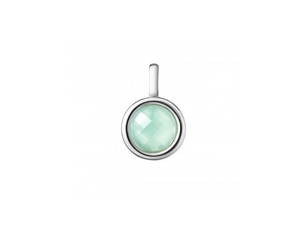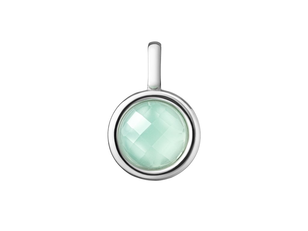 Stříbrný přívěsek s broušeným barveným krystalem. Průměr přívěsku 16,55 mm, výška včetně závěsného očka 24,90 mm, rhodiované stříbro.