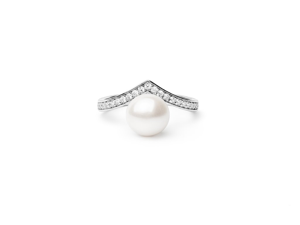 Stříbrný prsten s bílou perlou a zirkonky. Průměr perličky 7,60 mm, rhodiované stříbro. Velikost prstenu 58.