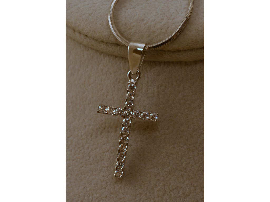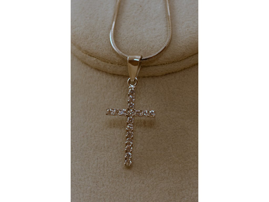 Stříbrný křížek se zirkony o rozměru 23,88 x 13,25 mm, ( 29,36 mm včet. závěsného očka). Rhodiované stříbro.
