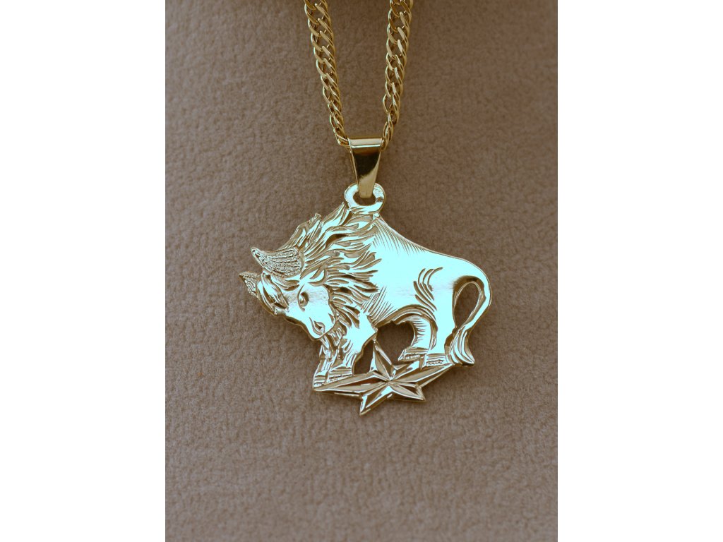 Přívěsek znamení býka ze žlutého zlata. Rozměr přívěsku - délka včetně závěsného očka 32,88 mm, šířka 29,11 mm.
