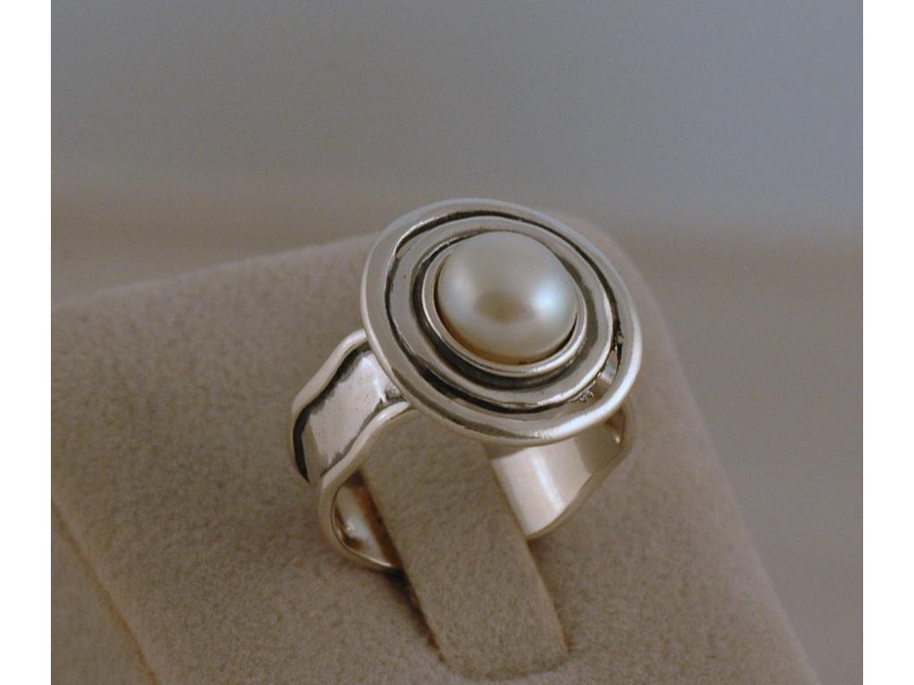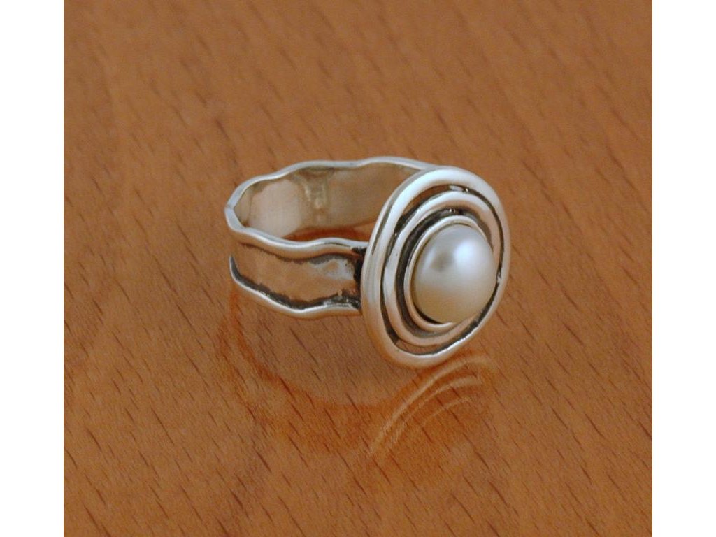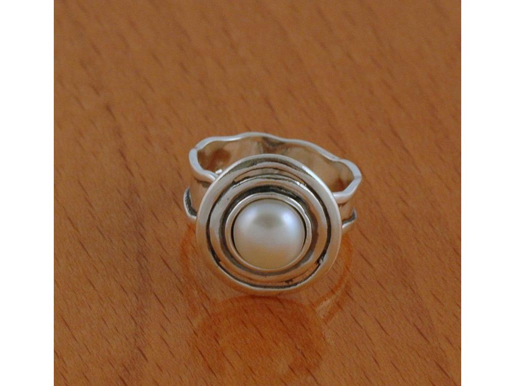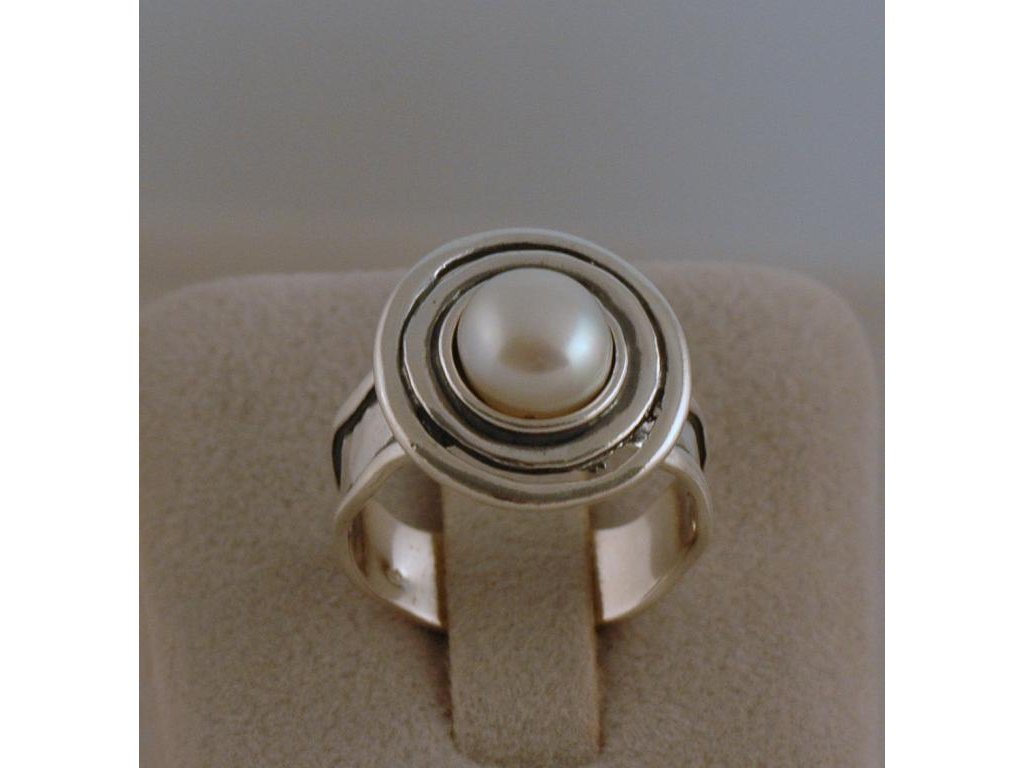 Široký stříbrný prsten s bílou perlou z izraelské kolekce ve velikosti 59,5. Průměr perličky 7,85 mm, olemování kolem perly 17 mm.