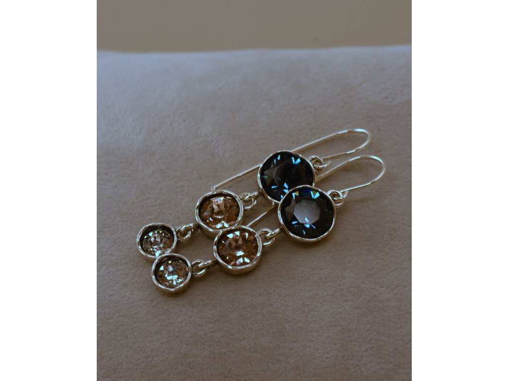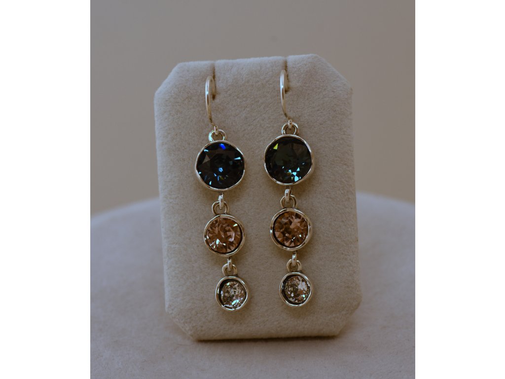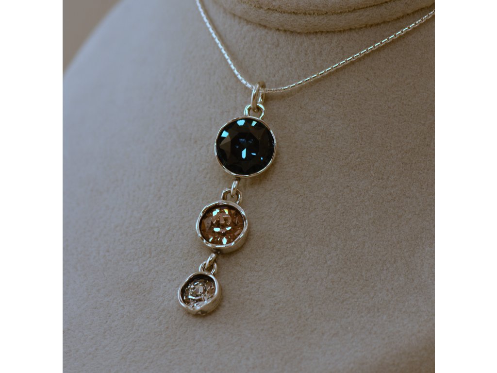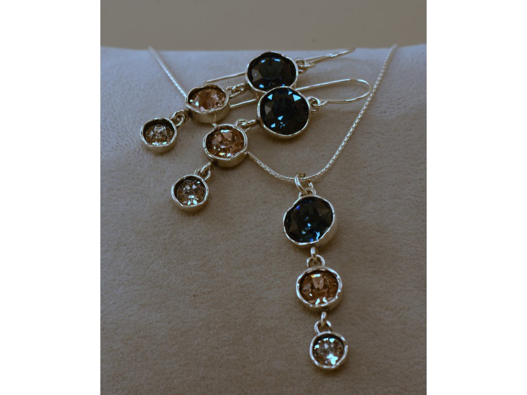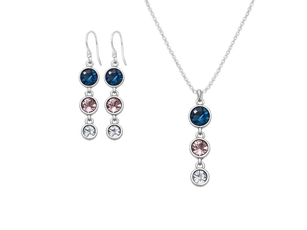Stříbrná souprava náušnic a jemného řetízku s přívěskem s barevnými zirkony (tmavě modrá, světle růžová, bílá).