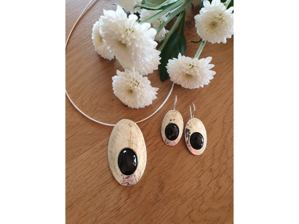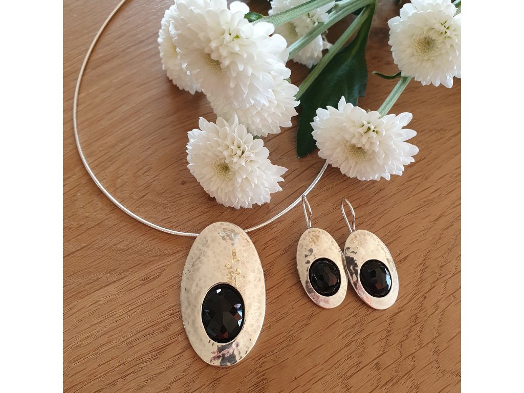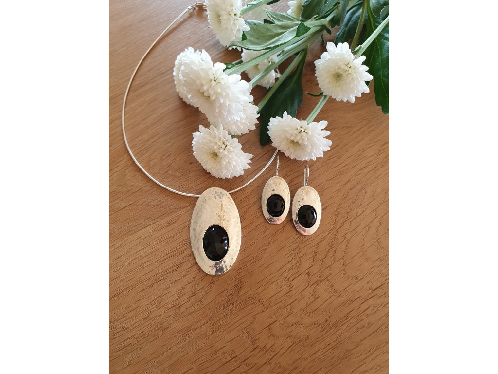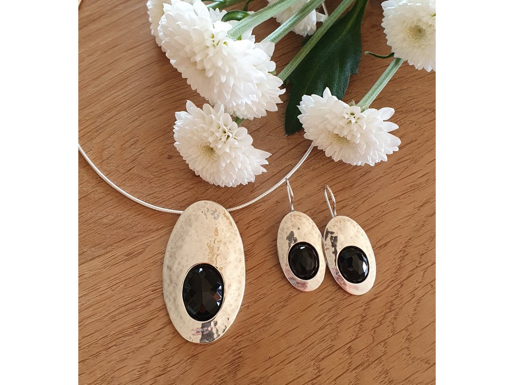 Souprava náušnic a masivního přívěsku na struně s onyxy. Rozměr náušnic 28 x 16,10 mm, velikost onyxů 12 x 10 mm.